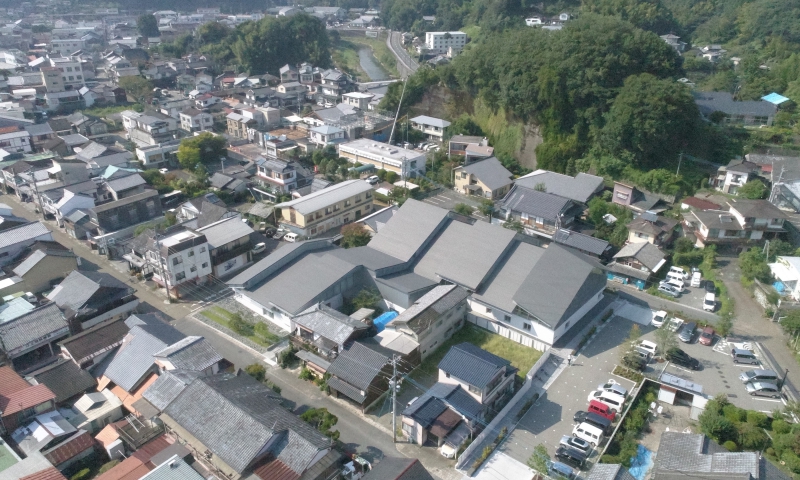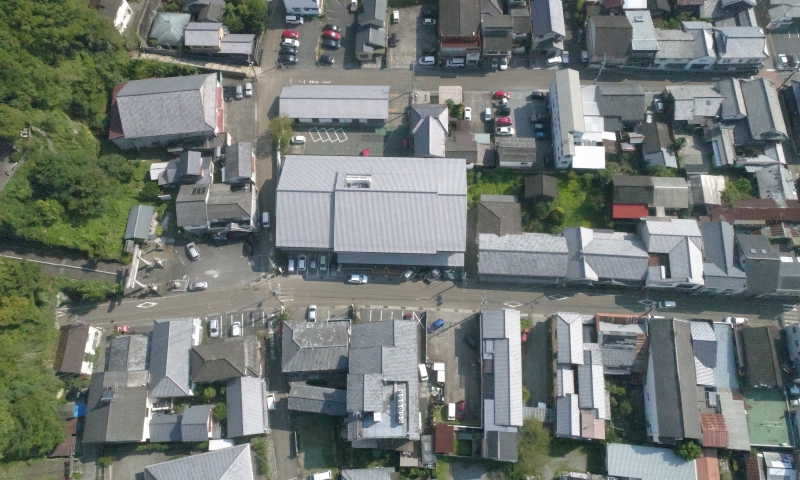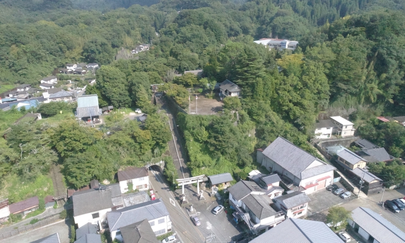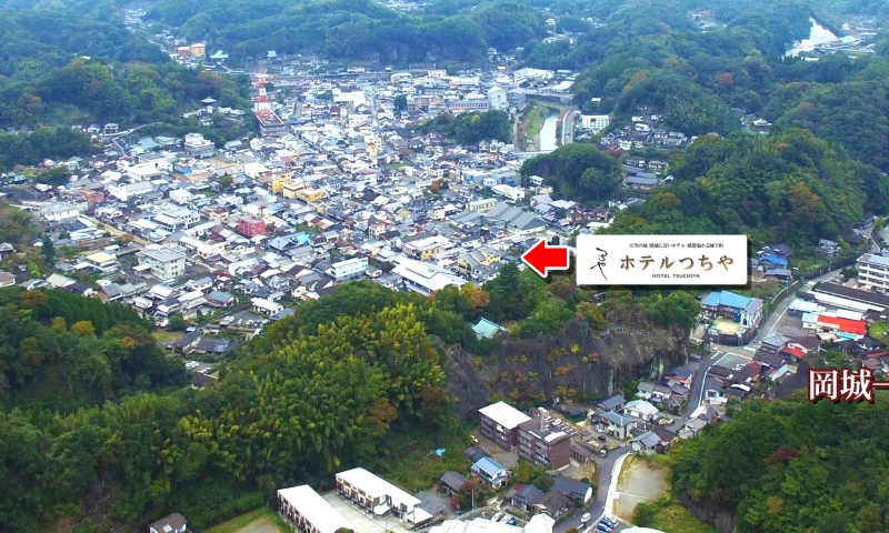 ホテルつちや上空から撮影した写真です。中央に廣瀬神社、左手に岡神社。中央下の駐車場の右手に郵便局がございます。岡神社には、裏手から登る駐車場がございますのでご高齢の方は、お車で参拝されても良いかと存じます。 郵便局の横から右手に通る道が歴史の道。歩いて風情溢れる城下町を散策する観光道路。