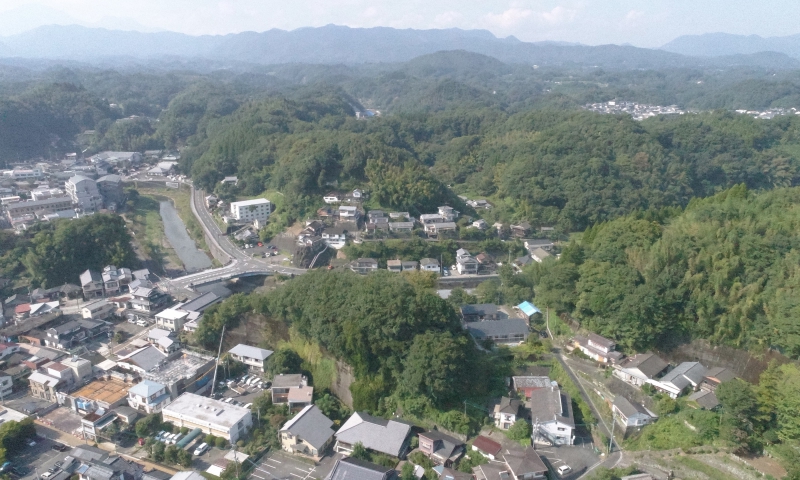 中央の山の下にJR豊後竹田駅があります。JR豊後竹田駅より川沿いに東(写真右)へ進むと竹田温泉花水月。駅の正面の通りには商店街がございます。