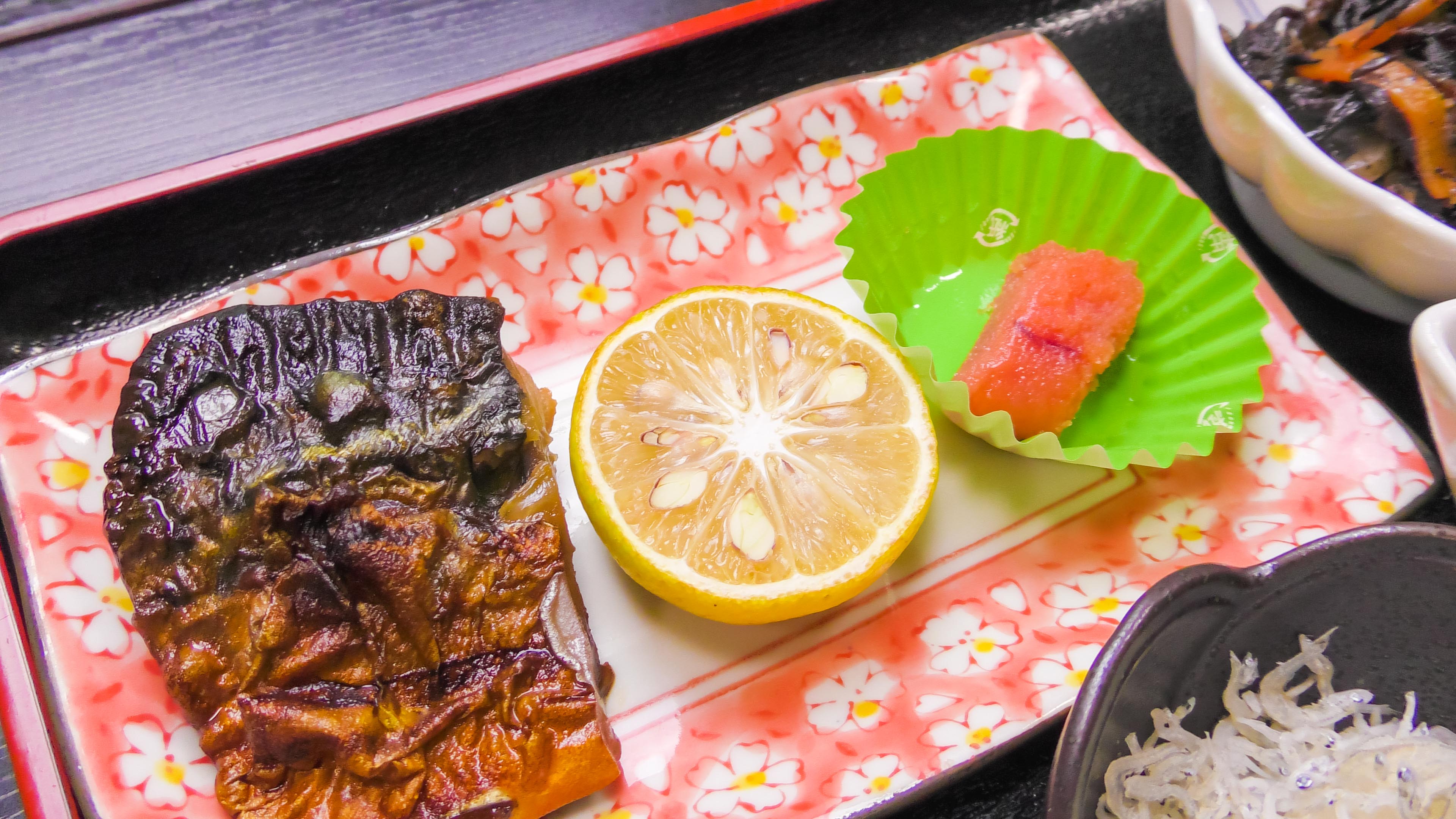 香ばしく焼き上げた焼き魚の添え物には、優しい酸味と絶妙なほろ苦さがたまらなく美味しいと評判の竹田カボス。