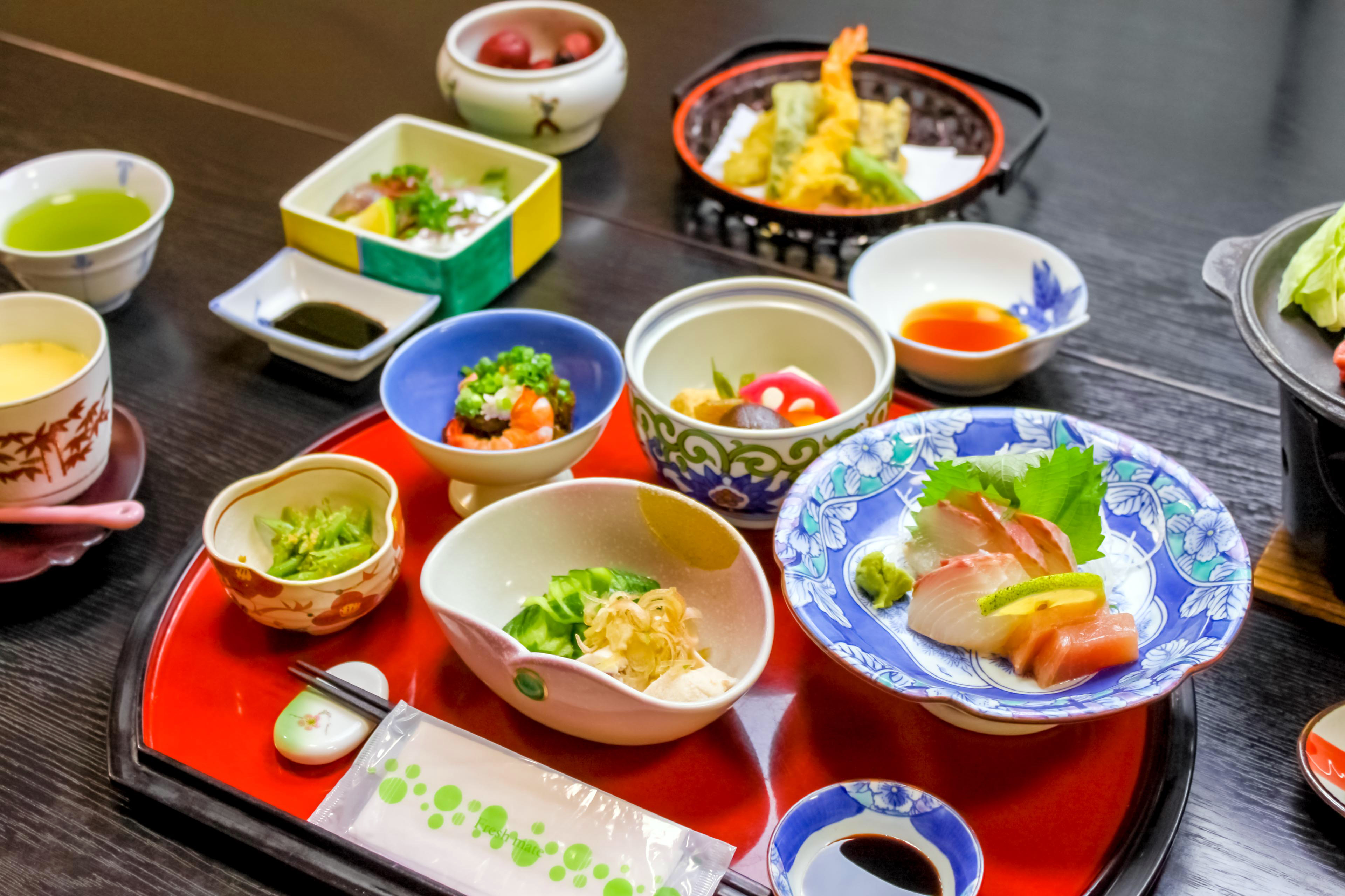 新鮮なお刺身と四季折々の旬の料理が並ぶ豪華な夕食