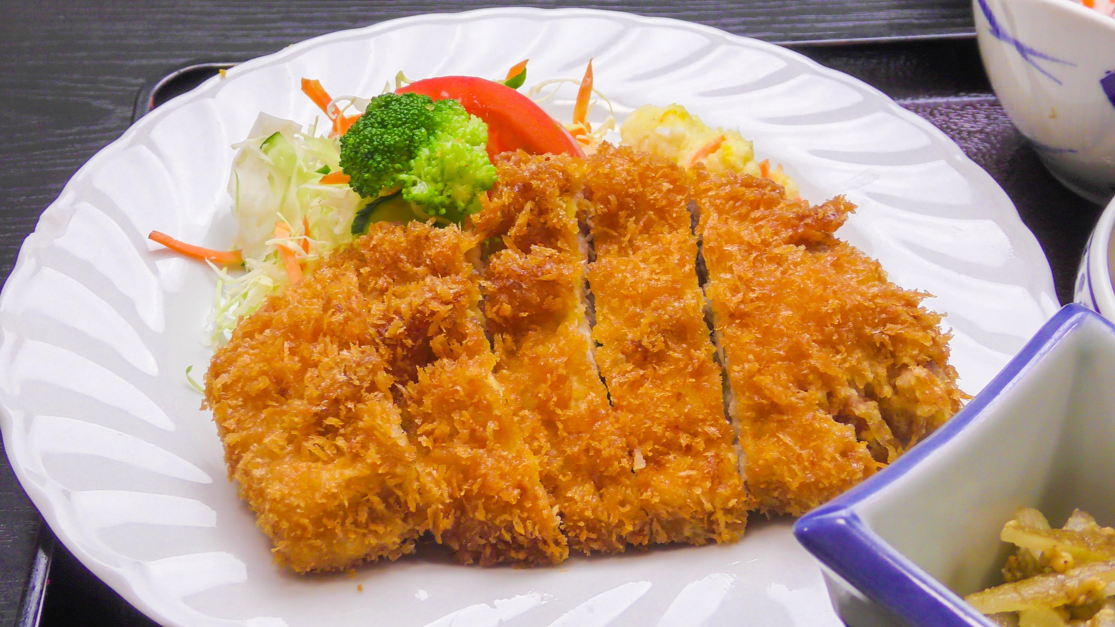 メインディッシュの肉料理は、地元企業直営農場の肉厚で美味しい豚肉を使ったトンカツ等。
